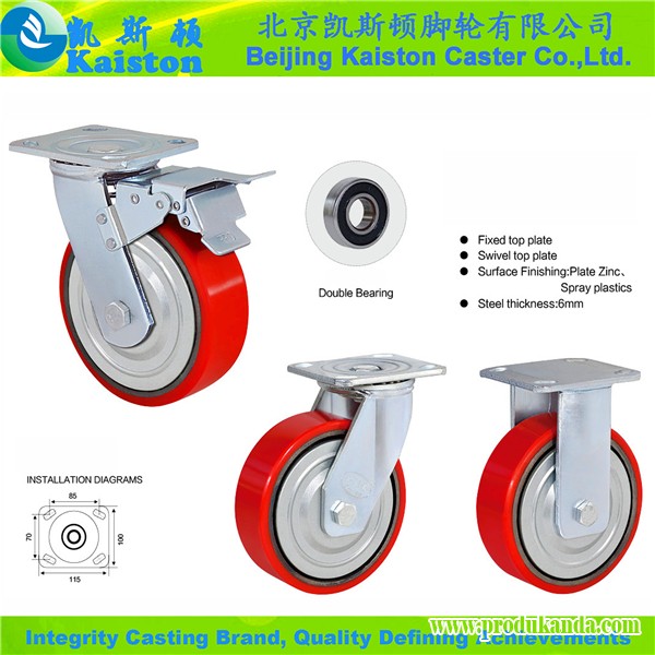 1.Heavy duty Polyurethane casters 2.Polyurethane wheels and Iron Hubs 3.Surface: Plate Zinc or Spray Plastic 4.Bracket Thickness: 6.0MM |